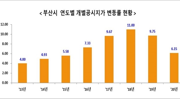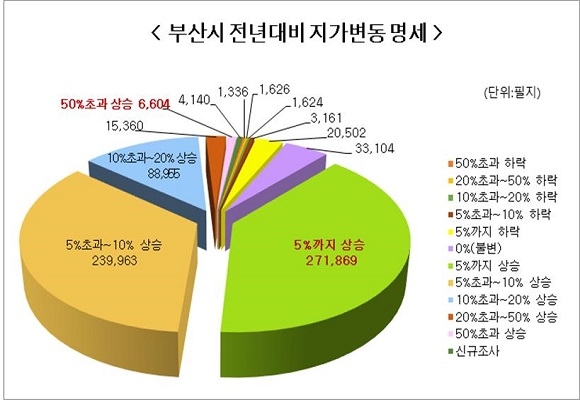 부산시가 올 1월 1일 기준 관내 16개 구·군의 개별 토지 총 68만 8244필지의 개별 공시지가 조사 산정 결과, 평균 지가변동률이 6.15% 상승했다고 29일 발표했다. 이는 전년도 상승폭인 9.76%보다 하락했다.
