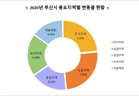 시의 용도지역별 변동률은 ▲주거지역 7.26% ▲상업지역 7.84% ▲공업지역 5.23% ▲녹지지역 6.18% ▲개발제한구역 4.66%의 상승세를 보였다. 다만 대다수 일반토지와 기타 개발계획이 없고 특별한 지가변동 요인이 없는 기존 주택지의 공시지가는 보합세를 유지하거나 변동률이 미미한 것으로 나타났다.