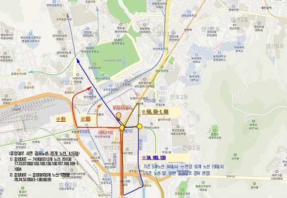 또 66, 88, 83-1번 3개 노선은 부전시장을 돌아 NC백화점에서 서면교차로를 통해 초읍방면으로 가며 54, 103, 133번 3개 노선은 범내골에서 NC백화점을 거쳐 서면교차로에서 초읍 쪽으로 변경된다.