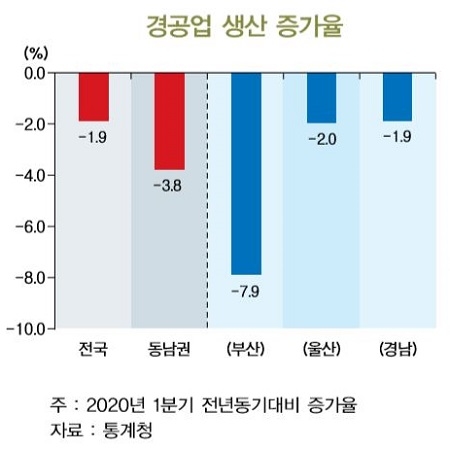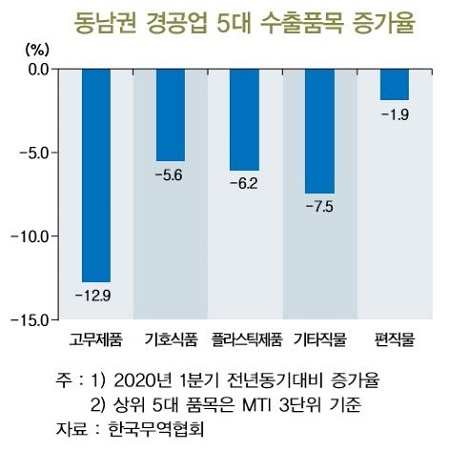 연구센터는 동남권에 입지하고 있는 21개 경공업 관련 상장기업의 영업이익이 올 1분기 가운데 전년동기대비 18.1% 감소한 것에 기인해 상대적으로 규모가 취약한 비상장기업은 더 큰 피해를 봤을 것이라 예측했다.