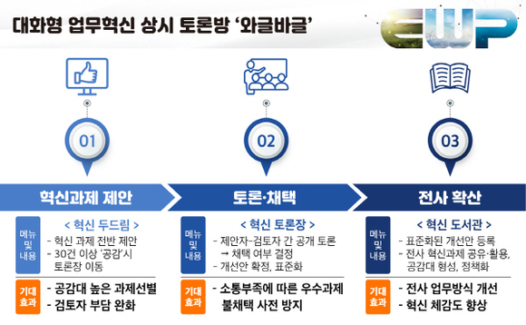 아이디어 제안 단계에서 일정 수 이상의 직원 공감을 얻은 제안은 ‘혁신 토론장’으로 이동돼 공개 토론을 거치게 되며, 개선안으로 채택될 경우 ‘혁신 도서관’으로 이동, 사내 정책화를 시행하게 된다.