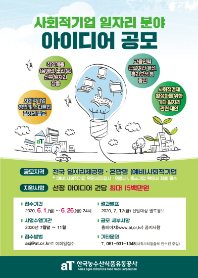 한국농수산식품유통공사(이하 aT)는 사회적기업의 일자리 창출과 성장을 지원하기 위해 ‘사회적기업 일자리 분야 아이디어 공모사업’ 참여자를 오는 26일까지 모집한다.