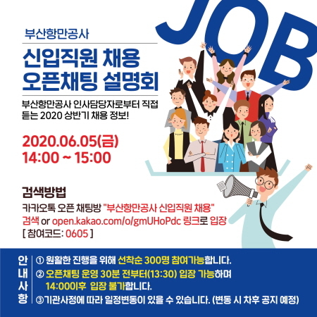 온라인 채용설명회는 청년층에 친숙한 온라인 매체인 카카오톡을 활용해 당일 오후 1시 30분부터 입장할 수 있다. 이는 카카오톡 오픈채팅방 ‘부산항만공사 신입직원 채용’을 검색하면 접속할 수 있다.