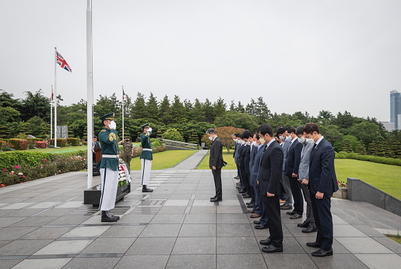 한국남부발전㈜이 3일 호국보훈의 달을 맞아 부산시 남구 대연동 소재 유엔기념공원을 방문한 가운데 임직원들이 한국전쟁 참전용사를 추모하고 있다.