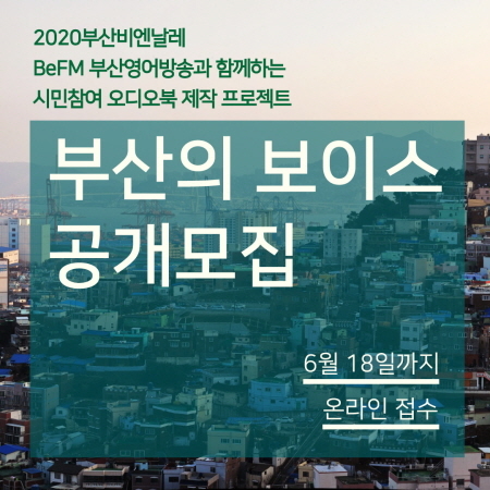 비엔날레 조직위는 심사를 거쳐 한국어 10명, 영어 10명을 최종 선정해 내달 중 부산영어방송의 전문 트레이닝 과정을 거쳐 녹음에 들어갈 예정이다. 2020 부산비엔날레 문집 오디오북은 전시 기간인 오는 9월 5일부터 11월 8일까지 부산비엔날레와 부산영어방송 홈페이지를 통해 무료로 공개될 예정이다.