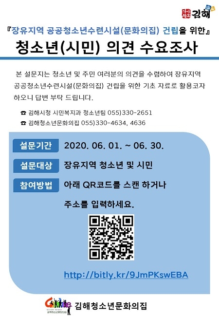 박종주 시민복지과장은 “수요자 중심의 시설 설치를 위해 6월 30일까지 설문조사를 진행하니 청소년과 주민들의 적극적인 참여를 기다린다”고 말했다.