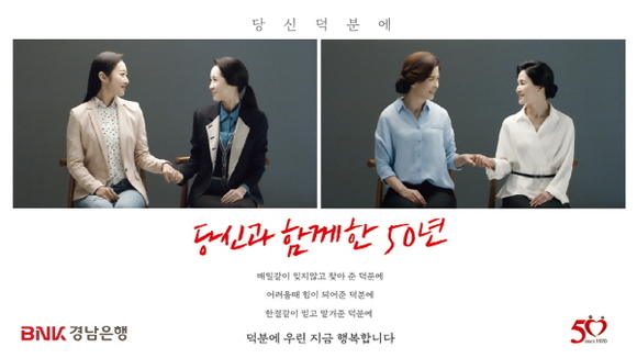 지난달 기념식에서 첫선을 보인 창립 50주년 기념 CF ‘당신 덕분에’는 경남은행 창립 50주년이 있기까지 한결같이 성원해준 고객의 에피소드를 담고 있다.