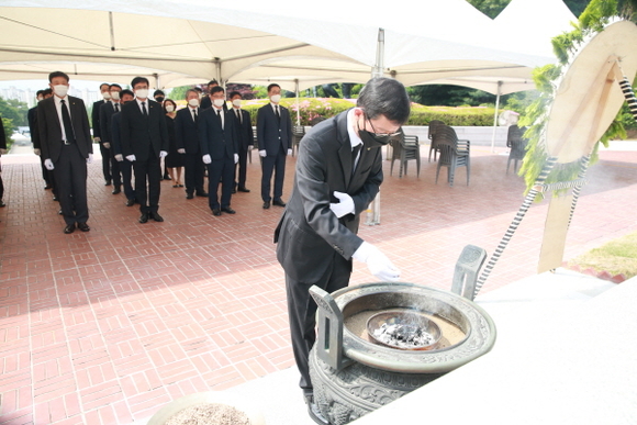 경남농협 임직원 20여 명이 5일 오전 10시 제65회 현충일 및 호국보훈의 달을 맞아 충혼탑을 방문해 참배하고 있다. 이날 참석자들은 순국선열의 고귀한 뜻을 기리고자 충혼탑을 방문해 6.25 전쟁 때 조국수호를 위해 낙동강 전선에서 산화한 호국영령들의 위패 1203위(경남지역 각 시·군 출신 대표영현)에 대해 헌화와 분향을 했다. (사진=경남농협 제공)