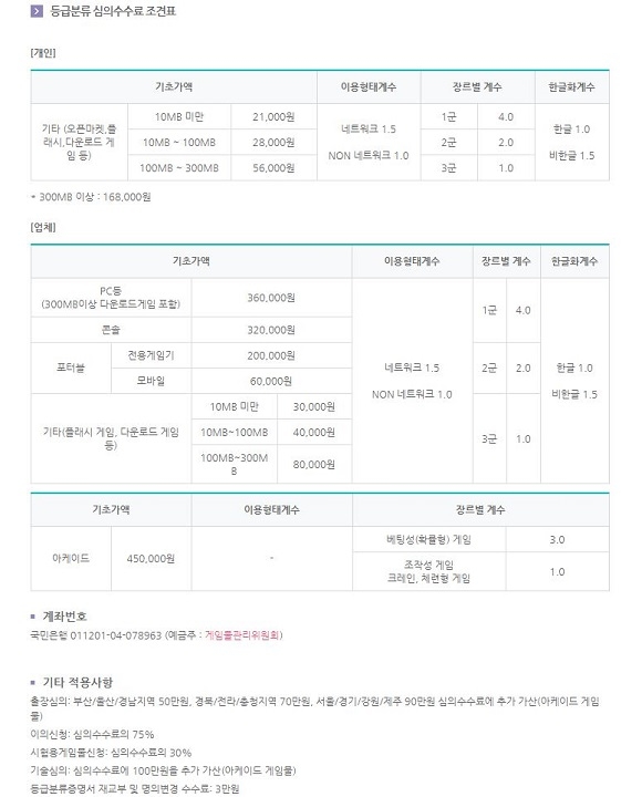 게임위가 요구하는 심의를 받게 되면 각종 등급분류 심의 수수료가 붙게 된다. 먼저 개인 개발자의 경우 게임 용량별로 10mb 미만의 경우는 2만 1000원에서 300mb 이상의 게임은 16만 8000원이 적용된다.