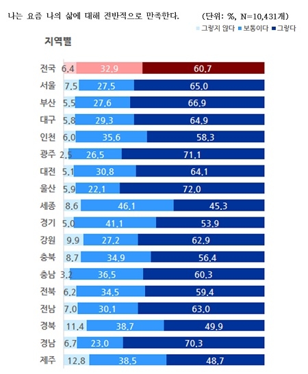 경남은 광역시·도별 삶의 만족도 조사에서 '자신의 삶에 대해 전반적으로 만족한다'는 응답비율이 70.3%로 1위 울산 72.0%, 2위 광주 71.1%에 이어 세 번째를 차지했다.