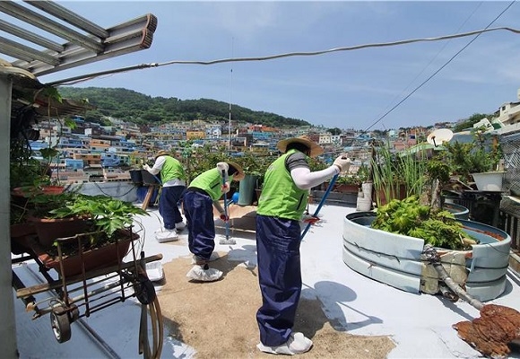 국민연금공단 부산지역본부가 지난 4일 사하구 감천문화마을 일대에서 취약계층 어르신 가구 40세대에 ‘쿨루프 시공사업’ 봉사를 진행했다고 8일 밝혔다.