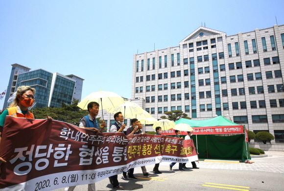 이날 이들은 학교 측에 ▲학내구성원의 합의 ▲민주주의 기본원칙 짓밟는 교수회장의 폭거 중단, 사죄 ▲학내구성원 대표자 협상단 통한 투표권 비율합의를 강력촉구했다.