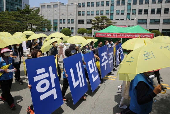 이날 시위에 참석한 조합원들과 지역 노동·시민사회단체 관계자 350여명은 각자의 요구사항을 적은 노란우산을 들고 “학내 민주주의 파괴하는 교수회장 규탄한다” “교수만 사람인가, 투표권 보장하라” 등의 구호를 외쳤다.