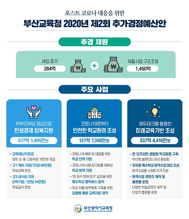 시교육청에 따르면 이번 추경은 코로나19 사태 장기화로 인한 위기를 극복하고 이와 함께 미래교육으로 나아가는 기반을 마련하는 등 포스트 코로나 대비에 역점을 두고 편성한 것이다.