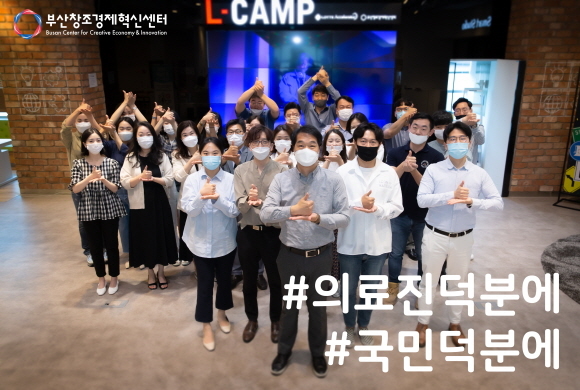 부산창조경제혁신센터가 9일 코로나19 극복을 위해 최일선에서 헌신하고 있는 의료진과 근무자들에 감사와 응원의 메시지를 전하는 ‘덕분에 챌린지’에 동참했다고 밝혔다.