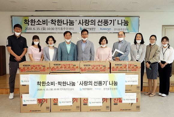 부산시설공단이 15일 오전 부산진구 연지동주민센터를 찾아 지역 소상공인들에게 사들인 고급 선풍기 30대를 취약계층에 기증하기 위해 김병호 연지동장에 전달했다고 밝혔다.