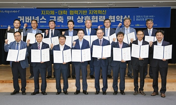 교육부 '지자체-대학 협력기반 지역혁신 사업' 공모를 준비 중인 경남도는 지난 12일 지역 대학과 기업, 연구기관 15개 기관과 공모사업 선정을 위해 공동 노력을 약속하는 협약을 체결했다.