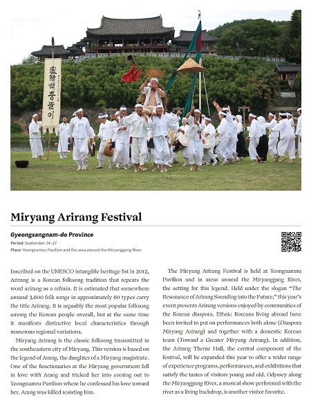 한국의 이색 축제로 경상도를 대표하는 밀양아리랑대축제를 포함해 서울, 경기도, 강원도, 충청도, 전라도, 제주도권 등 전국 7개 권역 대표 축제가 이번 여름호 LOCAL HRITAGE GUIDE란에 게재했다.