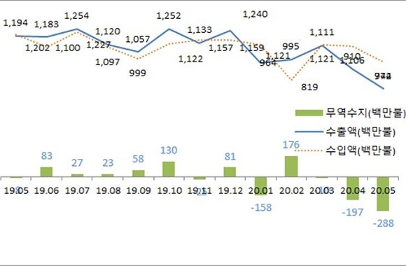 수출 증감률은 지난해 12월 14.8% 감소를 시작으로 지난 1월 19.4%, 2월 1.1%, 3월 1.1%, 4월 23.2% 계속 감소세를 이어온 바 있다.