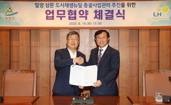 경남 밀양시는 쇠퇴한 삼문동 구도심에 새로운 활력을 불어넣을 삼문동 도시재생 뉴딜사업을 한국토지주택공사(LH) 경남지역본부와 협력, 추진하기 위해 16일 총괄사업관리자 업무협약을 체결했다.