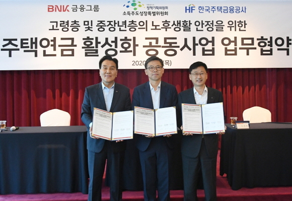 BNK금융그룹과 한국주택금융공사(주금공)가 18일 오전 BNK금융 본점에서 소득주도성장 특별위원회와 ‘주택연금 활성화 업무협약’을 체결했다고 밝혔다.