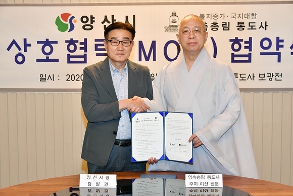 경남 양산시와 통도사는 '통도사 세계문화유산 등재'를 기념해 지역 상생발전을 위해 힘을 모으기로 했다.