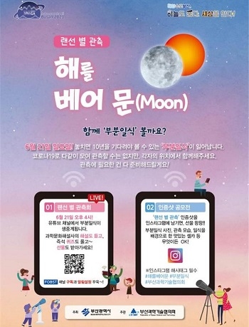 부산시와 ㈔부산과학기술협의회는 오는 21일 오후 4시부터 유튜브를 활용해 온라인으로 2시간 동안 부분일식 현상을 생중계할 예정이라고 19일 밝혔다.