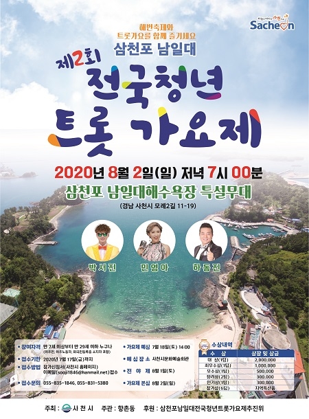 경남 사천시는 오는 8월 2일 삼천포 남일대 해수욕장에서 '제2회 삼천포 남일대 전국청년 트롯가요제'를 연다고 19일 밝혔다.