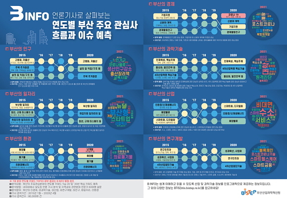 부산산업과학혁신원(BISTEP)이 부산지역 ‘경제’ ‘산업’ ‘인구’ ‘환경’ ‘일자리’ ‘과학기술’ ‘연구개발’ 7개 분야에 대한 내년도 예측 이슈를 22일 발표했다.