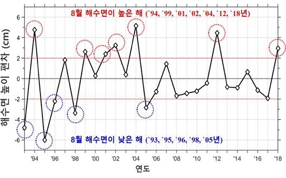 반대로 고·저기압이 약하게 발달해 남동풍이 약한 해에는 평년 대비 5㎝ 이상 낮아지는 현상을 확인했다. 기압의 강도에 따라 8월 평균 해수면이 높은 해와 낮은 해가 결정돼 그 차이가 5~10㎝ 이상 발생한 경우가 많았다고 해양조사원은 덧붙여 설명했다.