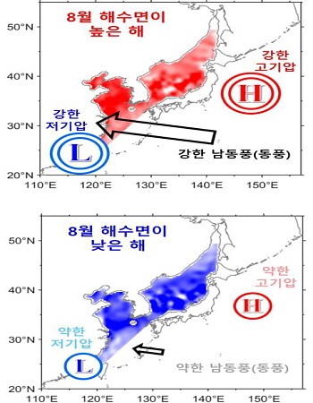 조사원은 여름철 국내 주변에 형성한 강한 고·저기압의 영향으로 기압골이 강하게 발달해 남동풍(동풍)이 크게 발생한 해에 국내 해역으로 밀려오는 해수가 많아져 평균 해수면이 평년보다 최대 5㎝가량 높아진 사실을 도출했다.