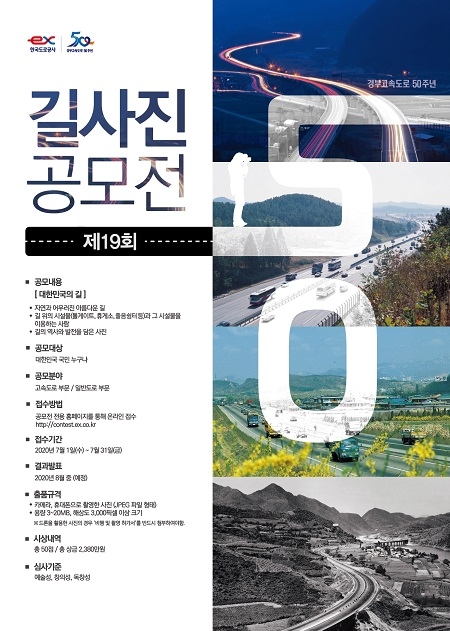 공모는 '고속도로'와 '일반도로' 2개 부문으로 진행되며, 도로를 촬영한 사진은 물론 길 위의 시설물(톨게이트, 졸음쉼터 등)과 그 시설물을 이용하는 사람들을 찍은 사진, 길의 역사와 발전을 담은 사진들도 출품이 가능하다.