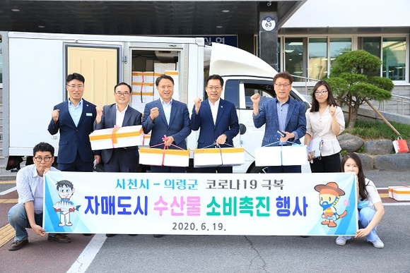 경남 사천시와 의령군이 지난 19일 코로나19로 위축된 수산물소비 촉진과 지역 상인들의 고통을 분담코자 자매도시 연계 수산물 소비촉진 행사를 가졌다.