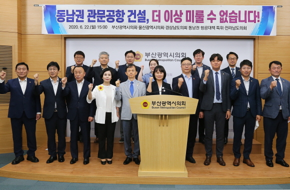 부산시의회, 울산시의회, 경남도의회, 전남도의회가 지난 22일 오후 부산시의회에서 ‘국무총리실 검증위원회의 김해신공항 적정성 검증에 대한 조속한 결정, 동남권 신공항 건설 촉구’ 호소문을 발표했다.