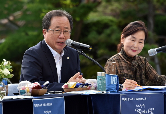 부산시교육청은 지난 23일 오후 시교육청 잔디광장에서 ‘톡!톡! 포스트 코로나 부산 교육’을 주제로 간담회를 열고 김석준 시교육감과 학부모·교직원·학생 간 대화의 장을 진행했다고 24일 밝혔다.