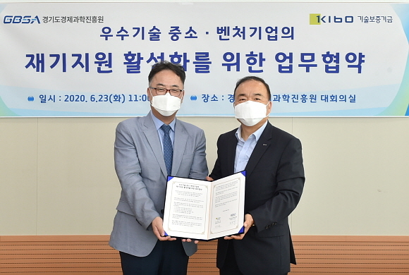 기술보증기금(기보)과 경기도경제과학진흥원(경과원)이 지난 23일 경기도 수원시 소재 경과원 본원에서 ‘우수기술 중소벤처기업 재기 지원 활성화 위한 협약’을 체결했다고 24일 밝혔다.