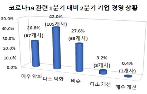 이에 앞선 2분기 지역 제조업의 경영 성적도 대부분 떨어진 것으로 확인됐다. 전체 부산상의 조사업체의 68.8%가 코로나19 사태로 인해 2분기 경영 상황이 1분기보다 더 악화했다고 응답했다.