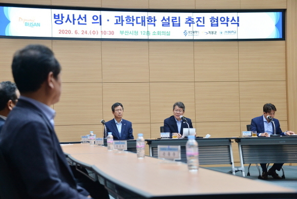 부산시와 기장군, 부경대학교가 24일 오전 10시 30분 시청 12층 소회의실에서 ‘기장 방사선 의·과학대학 설립’ 업무협약을 체결했다고 밝혔다.