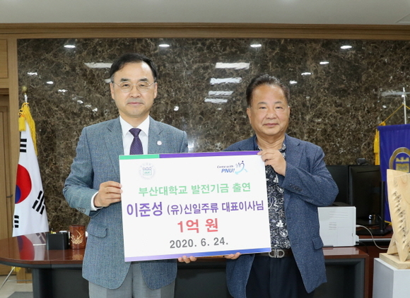 부산대학교는 경상남도 김해시의 도소매·유통업체인 (유)신일주류 이준성 대표가 24일 오전 교내 본관 5층 회의실에서 부산대 발전기금 1억원 출연을 약정했다고 밝혔다.