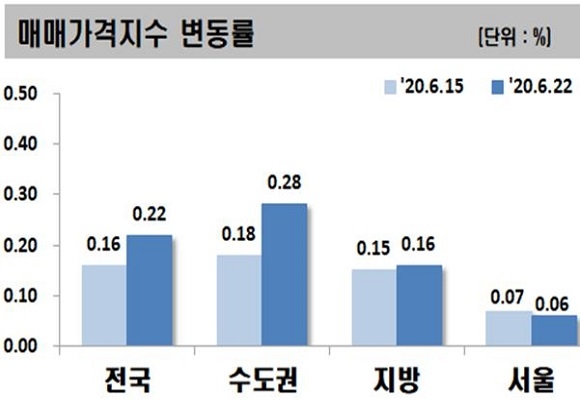 한국감정원이 올해 6월 넷째 주 전국 주간 아파트 가격 동향을 조사한 결과를 25일 발표했다. 이에 따르면 이번주 아파트 매매가는 전주대비 0.22% 상승했으며 전세가는 0.14% 상승했다.
