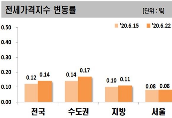 6월 4주차 아파트 전세가는 전주대비 0.14% 상승했다. 수도권의 상승폭은 0.17%로 전주 0.14% 보다 상승했으며 서울은 지난주 0.08% 상승폭을 이번주에도 유지했다.