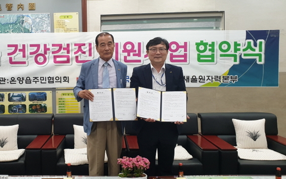 한국수력원자력 새울원자력본부는 온양읍 주민의 복지 증진을 위해 25일 온양읍행정복지센터에서 문정진 온양원전지역 주민협의회 회장을 비롯한 협약병원 관계자들이 참석한 가운데 주민 건강검진사업 지원에 관한 협약을 체결하고 4억원을 지원하기로 했다.