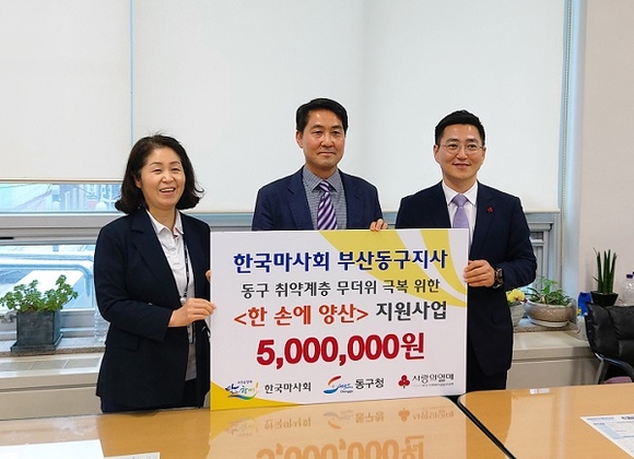 한국마사회 부산동구지사는 지난 18일 관내에서 추진하는 '한손에 양산사업'을 지원하기 위해 후원금 500만 원을 동구청에 전달했다.