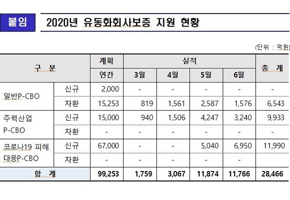 이달 발행에는 씨제이푸드빌(외식), 장금상선(해운), 서연이화(자동차부품) 등 코로나19로 직접적인 피해를 본 업종과 소상공인 원리금 상환 유예에 적극 참여한 여전사에 7000억원을 우선 지원했다.