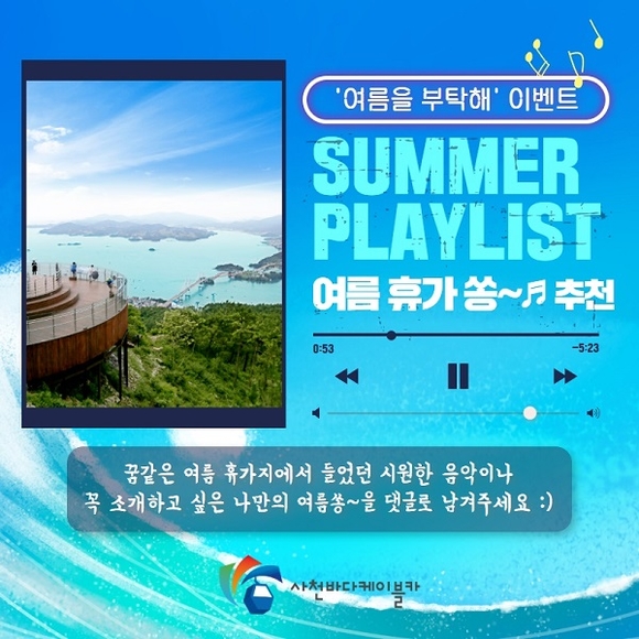 사천시시설관리공단은 7월을 맞아 사천바다케이블카를 널리 알리기 위해 전 국민 누구나 참여 가능한 SNS 댓글 이벤트를 진행한다고 30일 밝혔다.