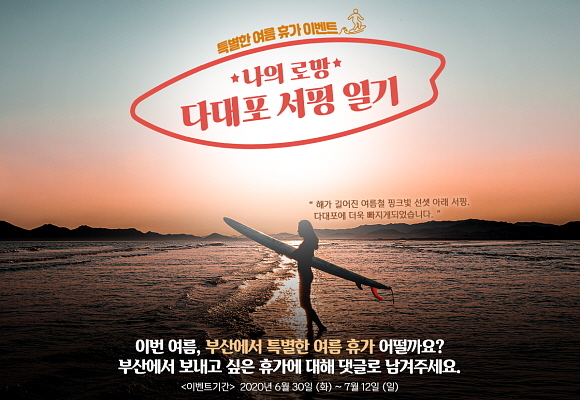 공사는 이번 언택트 관광지 선정 기념으로 ‘부산에서 특별한 여름휴가’ 이벤트를 열고 10명을 추첨해 다대포 서핑 일일 강습권을 제공한다. 참여 방법은 오늘(1일)부터 오는 12일까지 공사의 공식 인스타그램에 ‘부산 여행 가고 싶은 친구’ 태그와 ‘부산에서 보내고 싶은 여름휴가’를 댓글로 쓰면 된다.