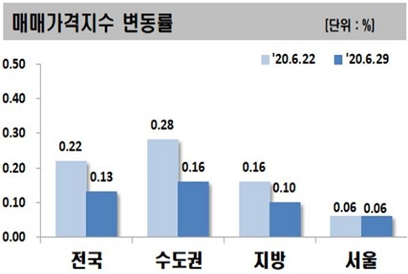 한국감정원이 올해 6월 다섯째 주 전국 주간 아파트 가격 동향을 조사한 결과를 2일 발표했다. 이에 따르면 금주 아파트 매매가는 전주대비 0.13% 상승했으며 전세가는 0.12% 상승했다.