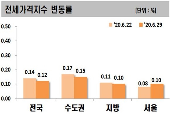 6월 5주차 아파트 전세가는 전주대비 0.12% 상승했다. 수도권의 상승폭은 0.15%로 전주 0.17%에 비해 상승폭이 소폭 줄었으며 서울은 지난주 0.08% 상승에서 금주 0.10%로 상승폭이 올랐다.