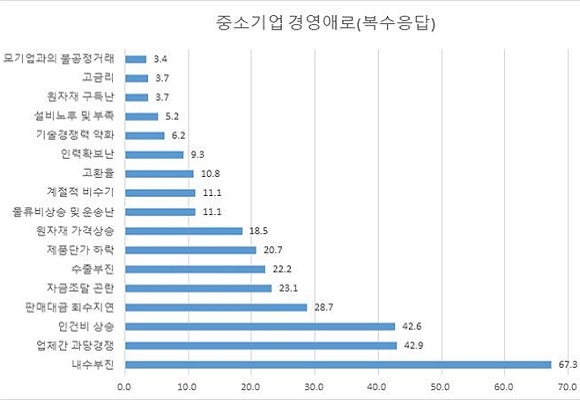 이와 함께 최근 부산·울산 중소기업의 경영 애로사항으로 ‘내수 부진’을 응답한 기업이 67.3%로 가장 비중이 컸다. 이어 ▲업체 간 과당경쟁 42.9% ▲인건비 상승 42.6% ▲판매대금 회수 지연 28.7% 등의 순으로 많이 응답했다.