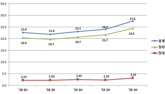 장내·외 채권결제대금은 26조원으로 직전반기 대비 13.7%(3조 1000억원) 늘어났으며 전년동기대비 18.3%(4조원) 늘어났다.